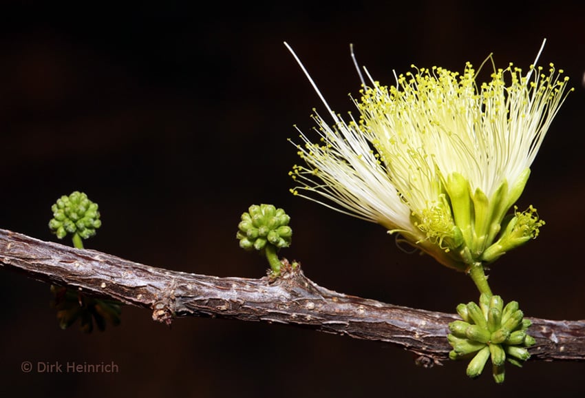 Einige wenige Kerzenakazien blühen ebenfalls und haben der Blütenpracht in Freiflächen, Flussbetten und einigen Gärten mit endemischen Bäumen und Sträuchern einen gelblichen Farbton hinzugefügt. Leicht gekrümmte Dornenpaare schützen die zahlreichen und kleinen kugelförmigen Blüten, die cremefarben sind und beim Verwelken gelb werden.