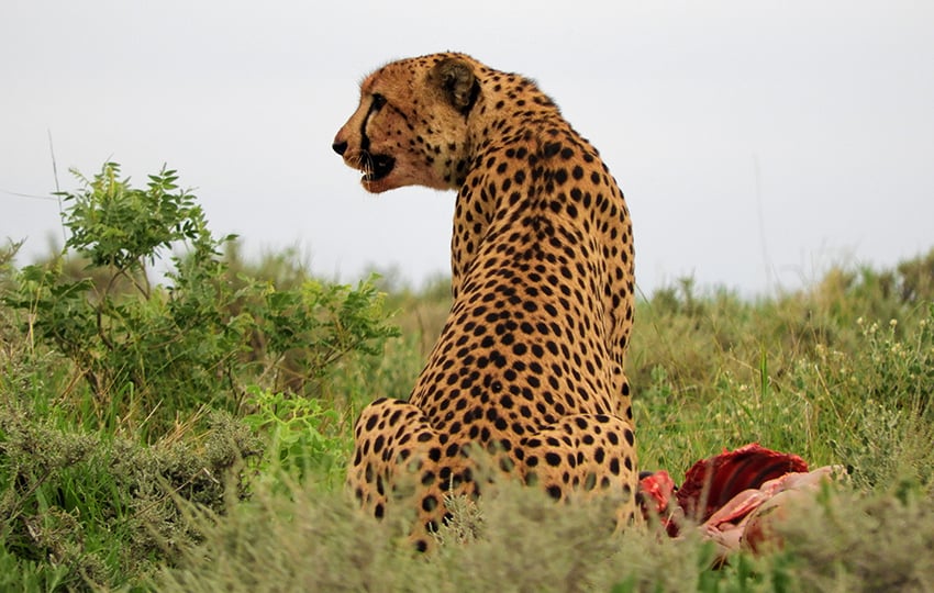 Ich bin auf dem Weg zurück nach Okaukuejo und zum Andersson-Tor, als ich an ein vor mir geparktes Fahrzeug heranfahre, um zu sehen, was seine Insassen entdeckt haben. Der Fahrer zeigt zur Seite. Es ist ein Gepard mit einem frisch gefangenen Springbock, der von zwei Schakalen bedrängt wird, die auch ein paar Bissen abbekommen wollen. Es ist einer dieser Anblicke in der grünen Jahreszeit, die man auch in der Trockenzeit nicht oft zu sehen bekommt. Ich beobachte das Geschehen lange Zeit, bis der Gepard aufsteht, satt nach einer guten Mahlzeit, sich umschaut, gähnt und im langen Gras verschwindet.