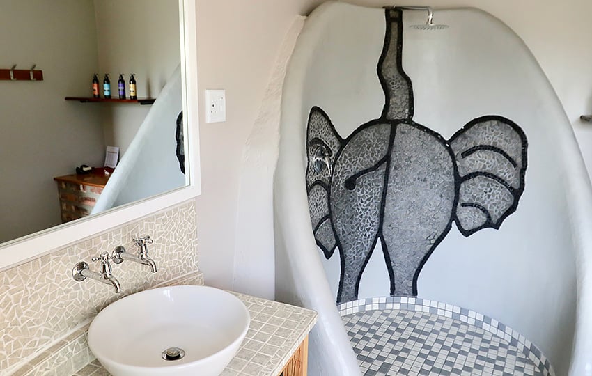 Am nächsten Tag fahren wir zwei Stunden über Asphaltstraßen weiter zum Etosha Safari Camp, wo wir die letzten zwei Nächte verbringen. Die Gästehäuser, welche in meinen Augen die coolste und passendste Dusche überhaupt haben, sind im Gelände verteilt.