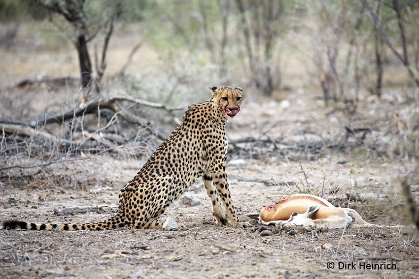 Erfolgreich war dieser Gepard direkt neben der Straße zwischen Namutoni und der Wasserstelle Koinagas am späten Nachmittag des 17. November 2019. Zahlreiche Touristen hatten die Gelegenheit, die Raubkatze beim Fressen zu beobachten, bevor die Sonne unterging und die Besucher zurück ins nahgelegene Rastlager mussten.