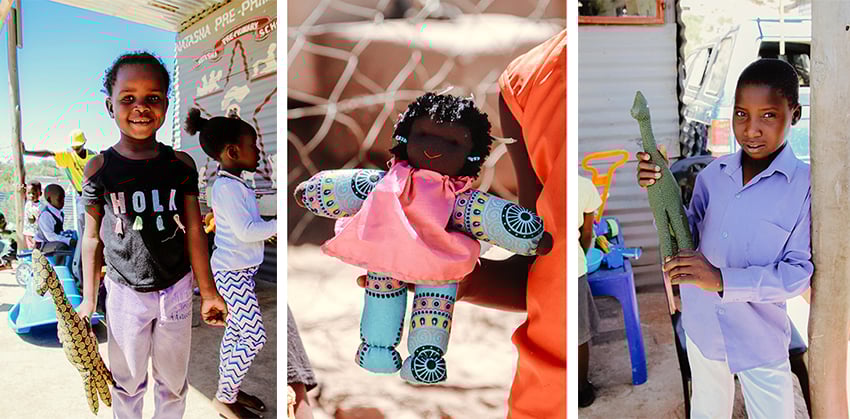 The Narrative wählte sorgfältig die meistverkauften Produkte von Gondwanas treuesten Lieferanten für handgefertigtes Spielzeug aus, das aus traditionellen Materialien genäht wird. Der im südlichen Afrika beliebte Shweshwe-Stoff, der von Missionaren nach Namibia gebracht wurde, besteht aus 100 % gefärbter Baumwolle mit interessanten Mustern. Dieses Material sowie das aus Westafrika stammende Wachstuch sind die am häufigsten verwendeten Materialien.