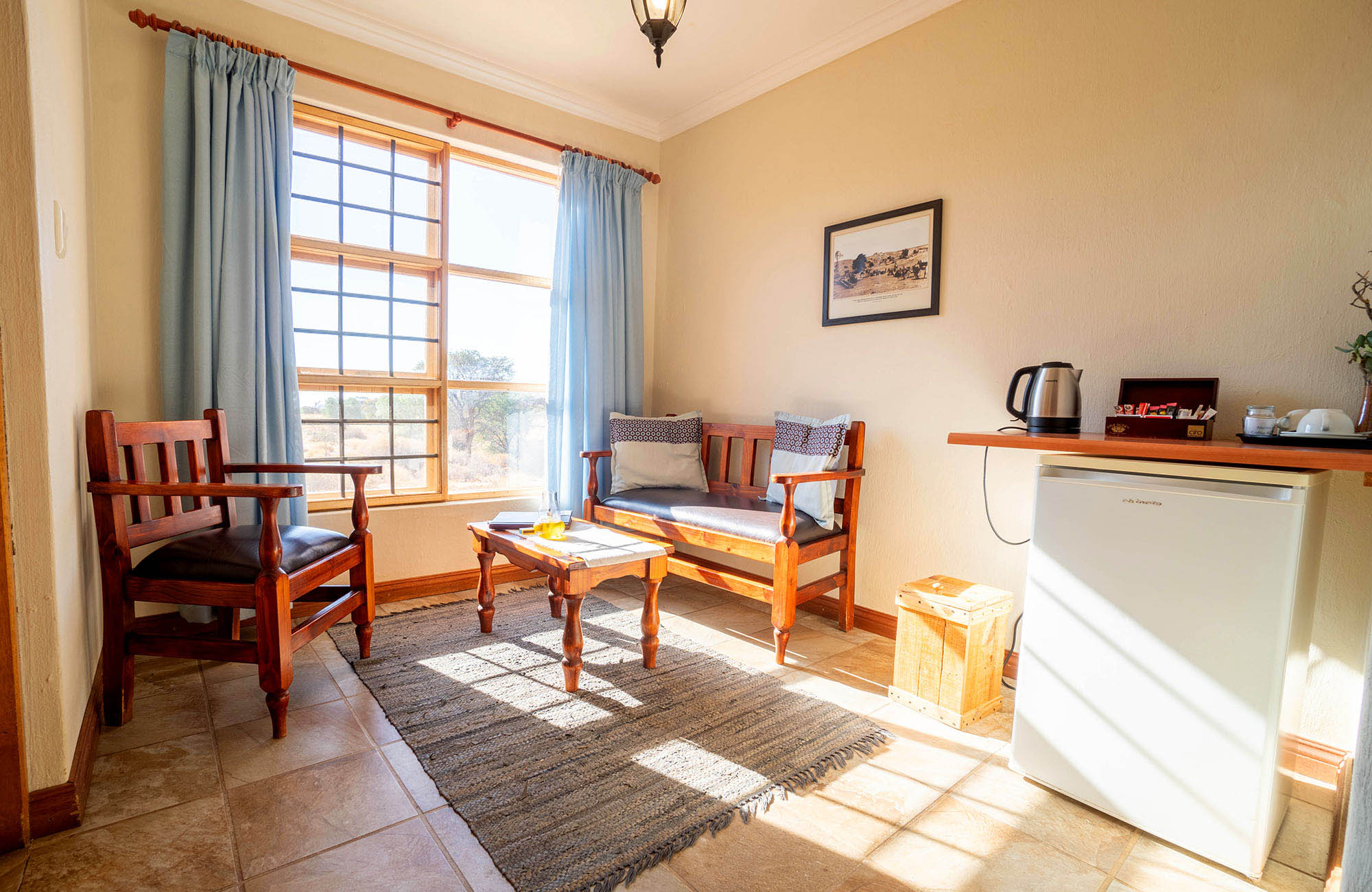 Les chambres spacieuses et accueillantes sont construites dans l’esprit des fermes du siècle dernier, et peintent d’une terre de sienne profonde, qui rougeoie d'une manière séduisante au soleil de fin d'après-midi. Reposez-vous sur votre véranda, savourez le calme de Klein Aus, participez aux excursions de jour ou au coucher du soleil, ou explorez les nombreux sentiers de randonnées et de VTT. Ici, vous découvrirez des vieux remparts datant de la Première guerre mondiale. Là, une vieille automobile Hudson criblée de balles, vestige d'une fusillade presque oubliée avec des contrebandiers de diamant. Sans oublier les points de vue extraordinaires, les springboks et, avec un peu de chance, les klipspringers en équilibre sur les pentes rocheuses. Un peu plus loin, rendez visite aux chevaux sauvages au point d'eau de Garub, à 20 km à l'ouest, et arpentez la ville fantôme des mineurs de diamants de Kolmanskop. Enfin, continuez jusqu’à Lüderitz, 100 km plus loin.